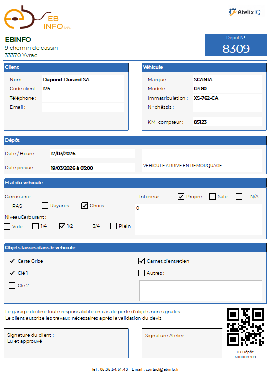 AtelixIQ permet d'établir un bon de dépôt complet avec les informations client, le véhicule, son état à l'arrivée, les objets laissés dans l'habitacle et les signatures utiles.