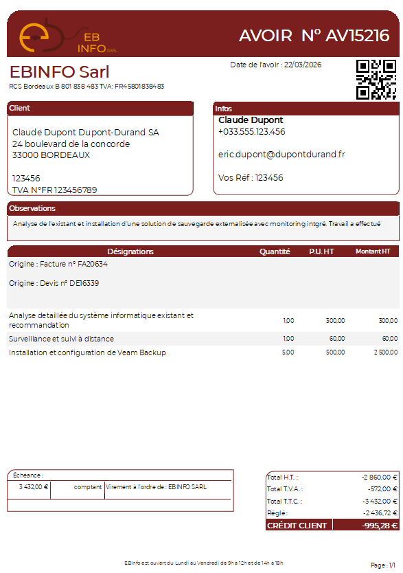 NexixIQ permet d'établir un avoir cohérent, traçable et compréhensible, avec rappel de la facture d'origine et du contexte commercial.