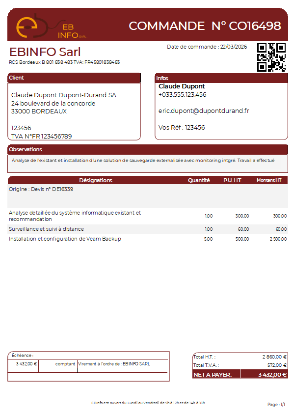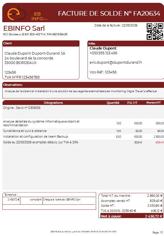NexixIQ est le noyau commun de la gamme logicielle EBinfo. Il prend en charge toute la chaîne commerciale : devis, commandes, proformas, factures d'acompte, factures de solde, avoirs et règlements.