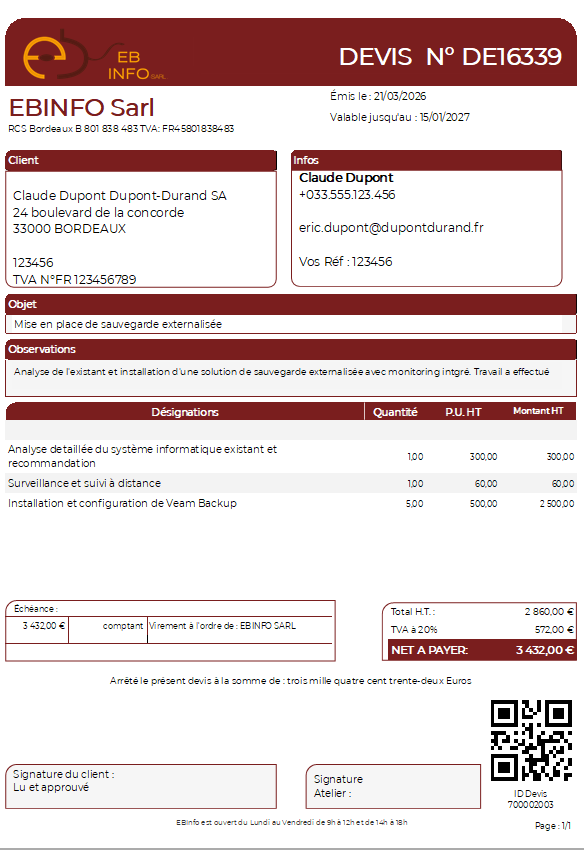 Le devis pose la base du dossier commercial : client, prestations, montants, observations et conditions de règlement.