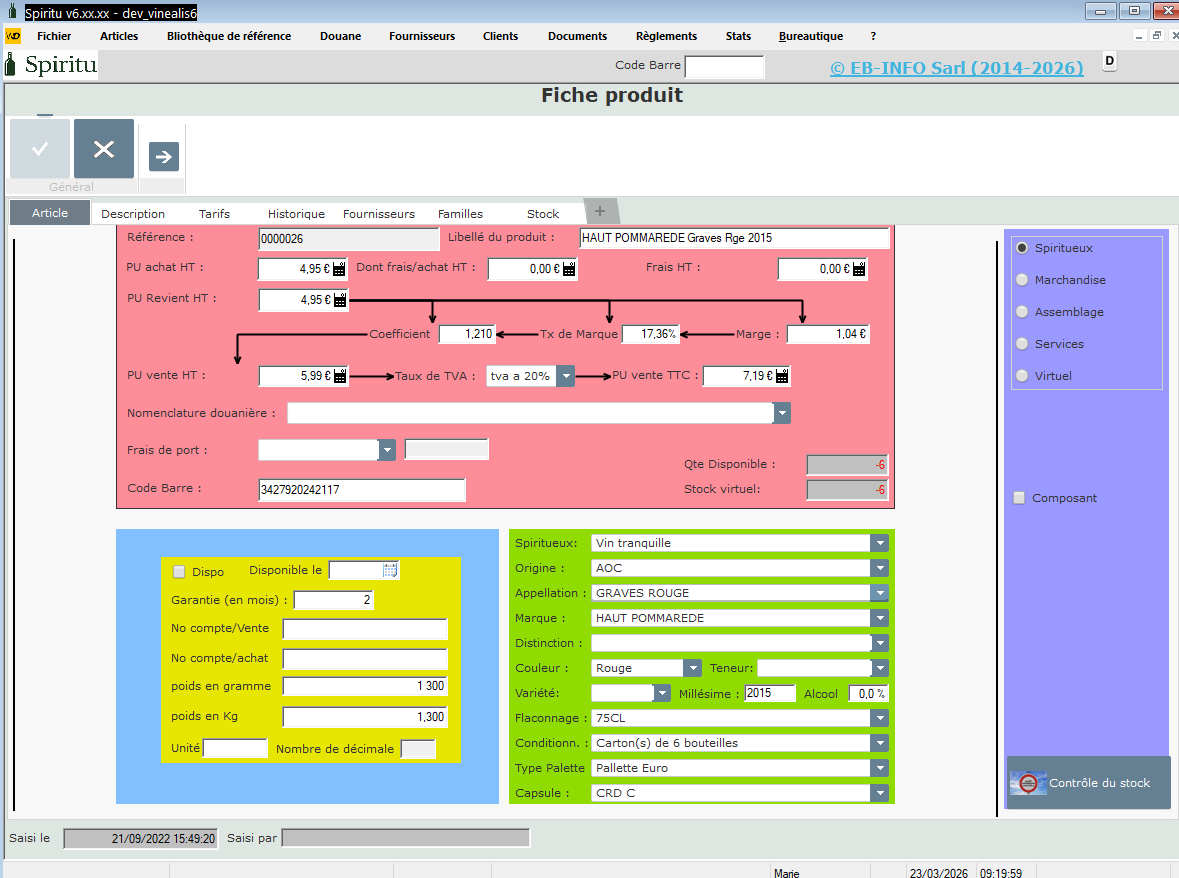 Spiritu permet de gérer à la fois la logique commerciale, la description métier des produits, la partie douanière et les opérations d'embouteillage.